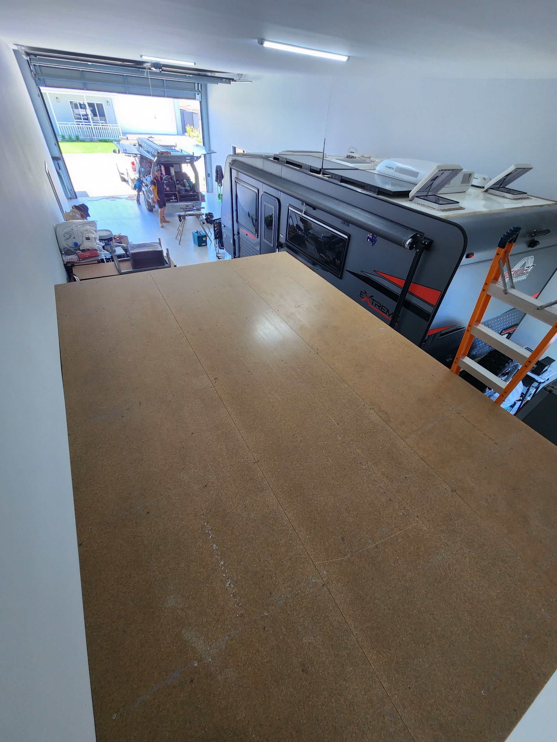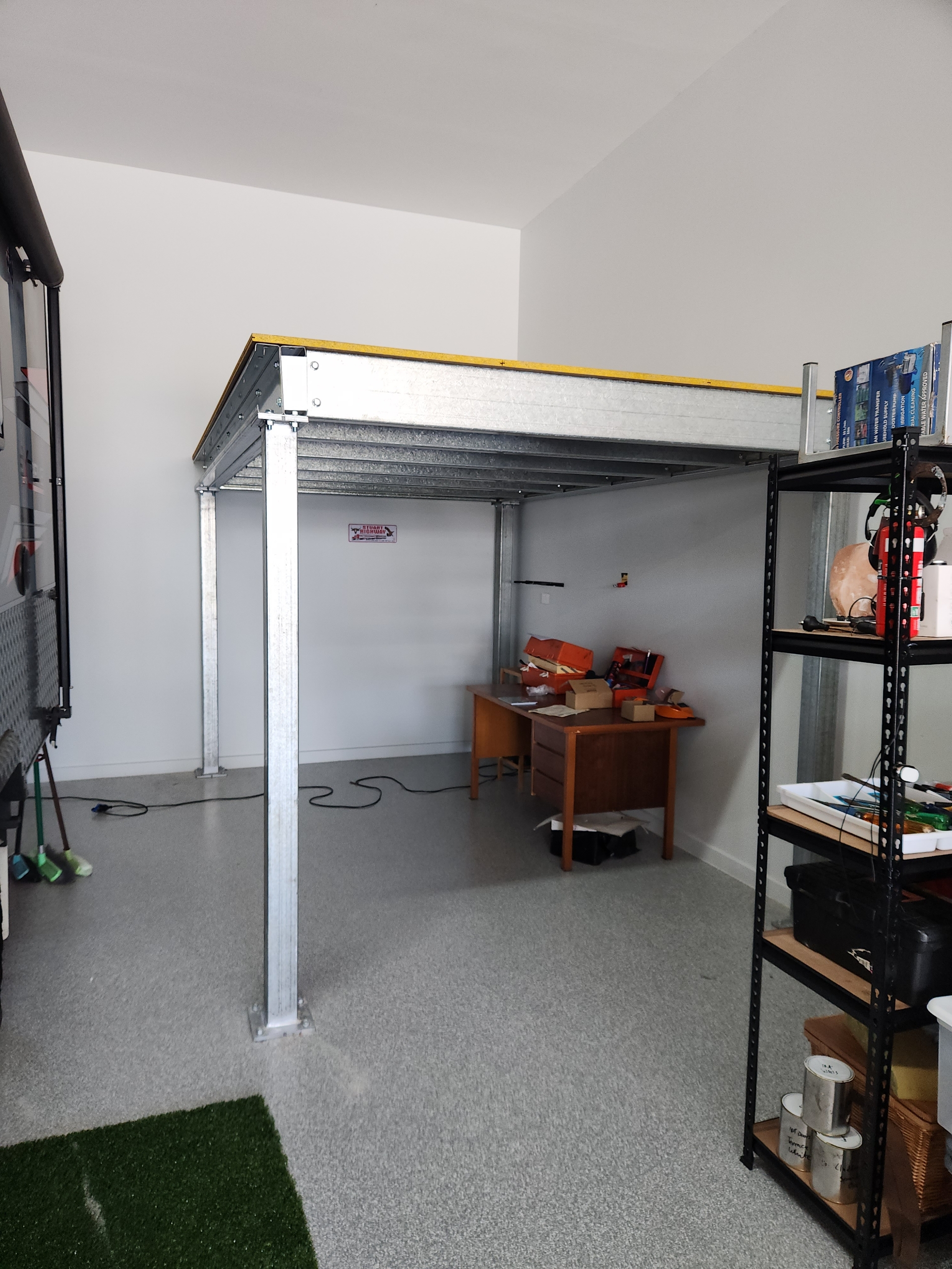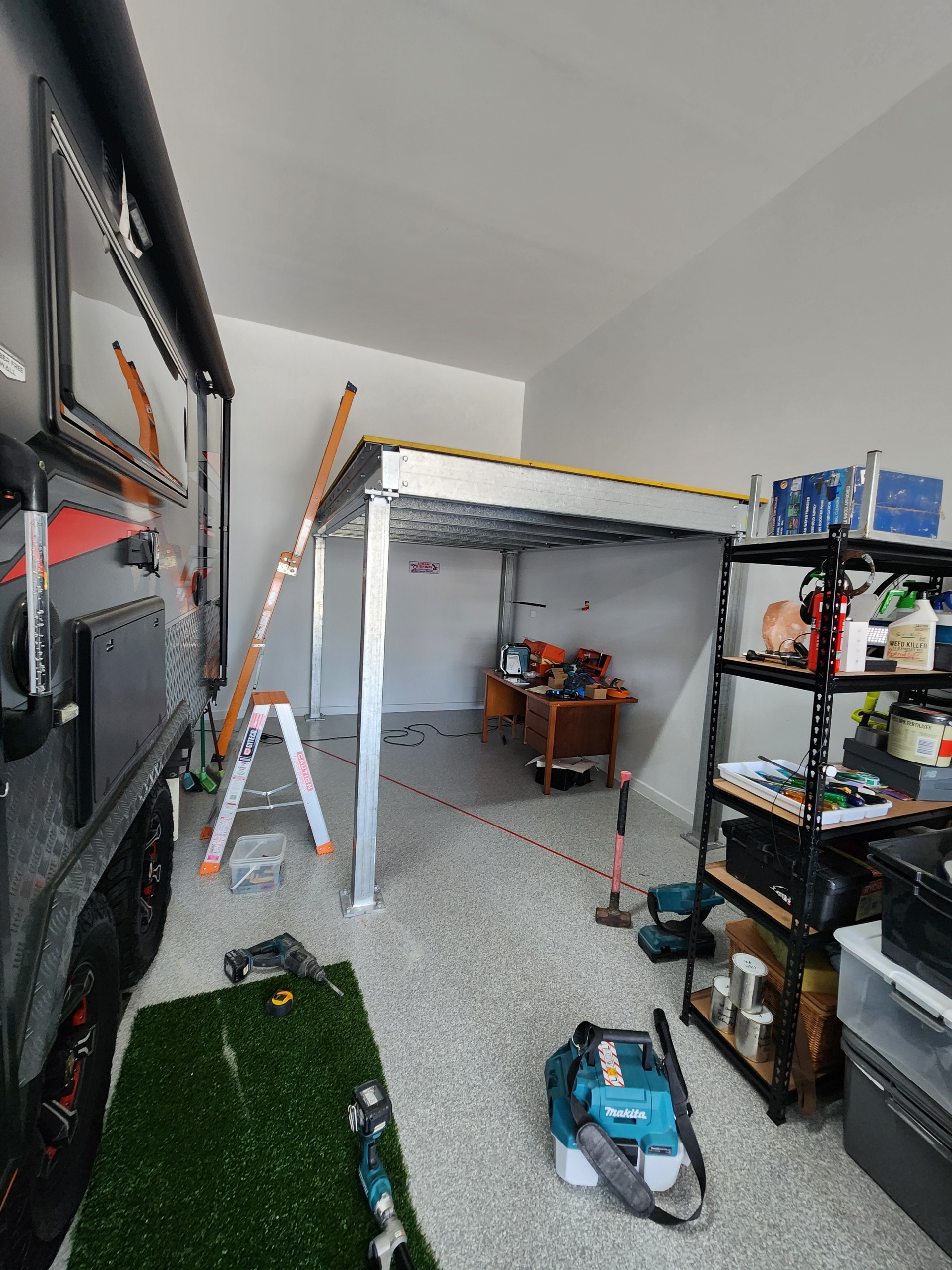 During the design process we were mindful to create extra storage without sacrificing space for the caravan to fit beside it. With a smart layout and the right materials, we delivered a solid mezzanine that keeps everything organised while still leaving plenty of room.