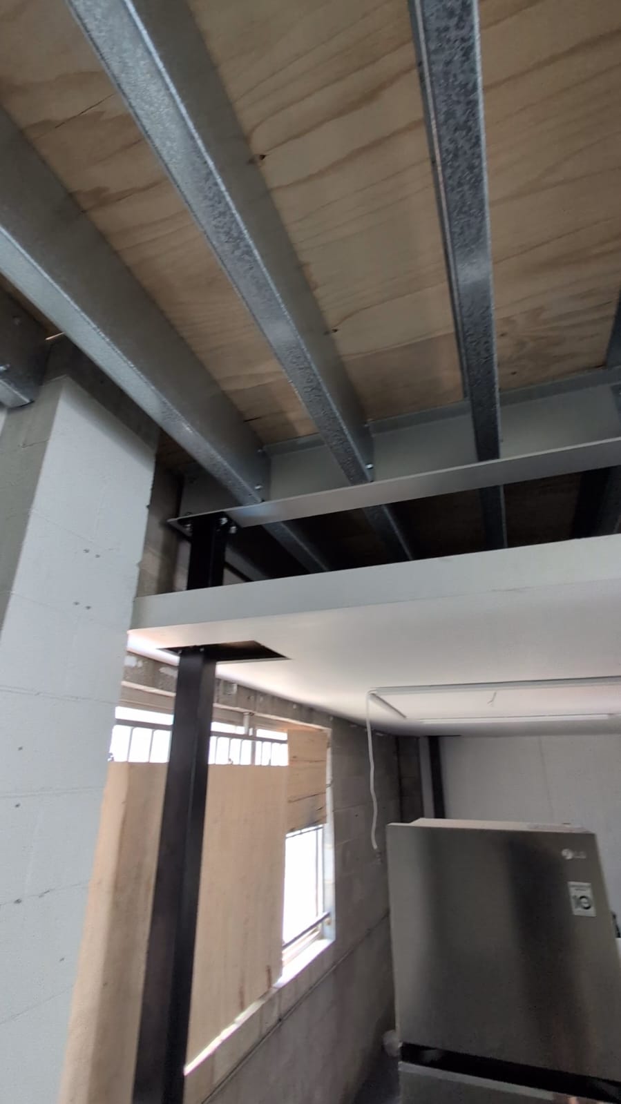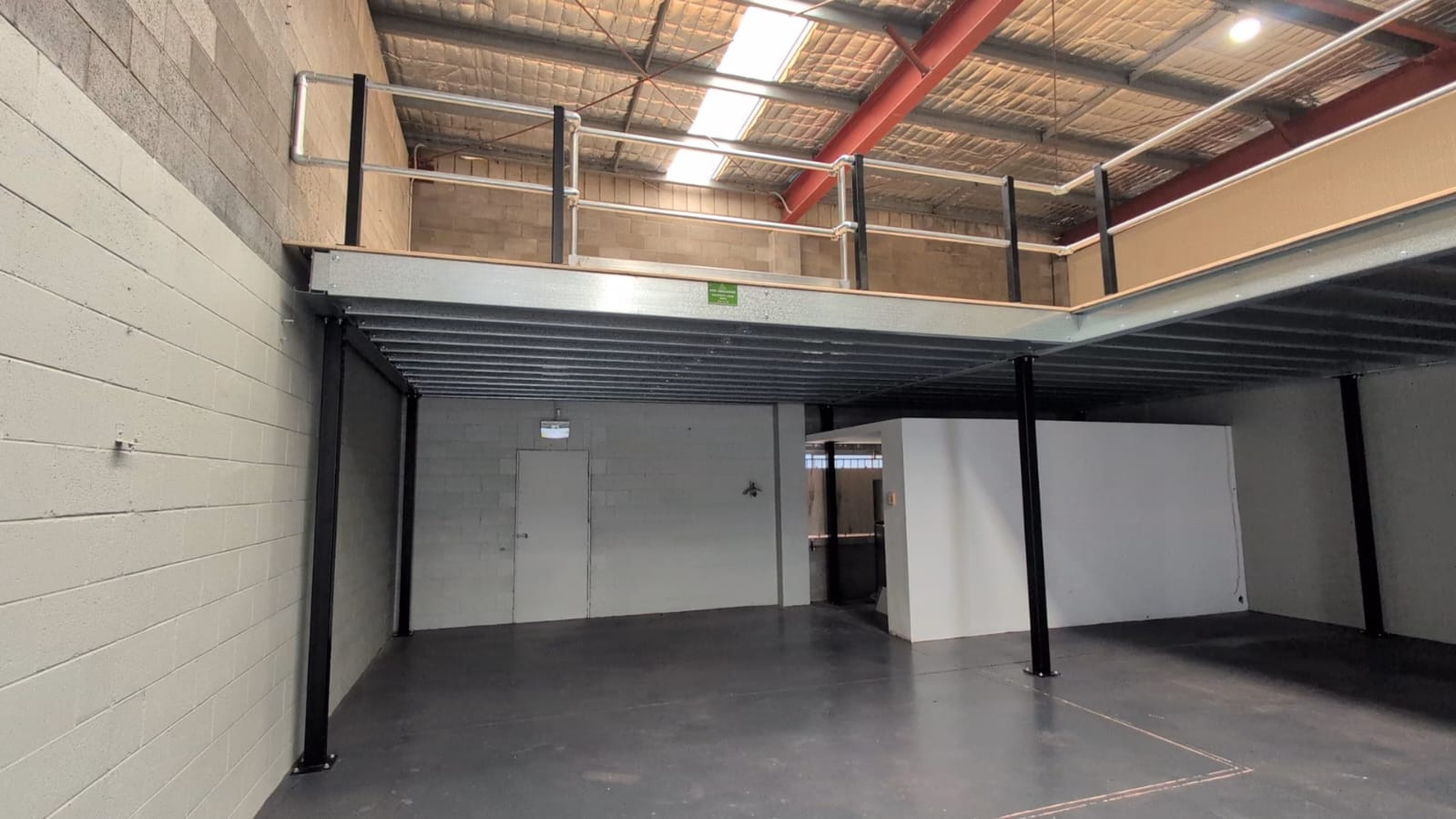 The layout also required a structural transition: moving from a back-to-back purlin beam into a heavier structural beam where the mezzanine formed its L-shape. We powder-coated this structural beam grey to blend seamlessly with the rest of the beams, keeping everything looking clean and intentional.