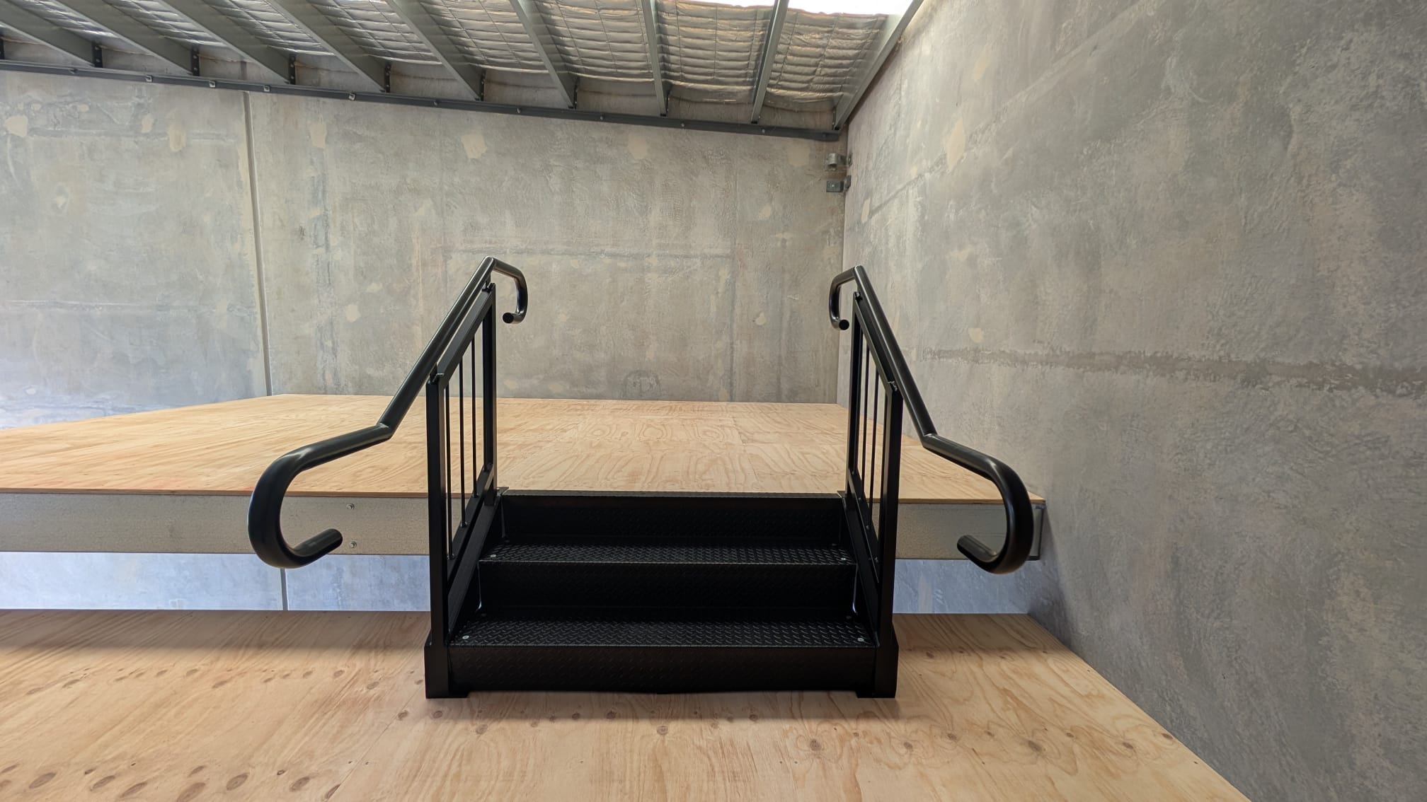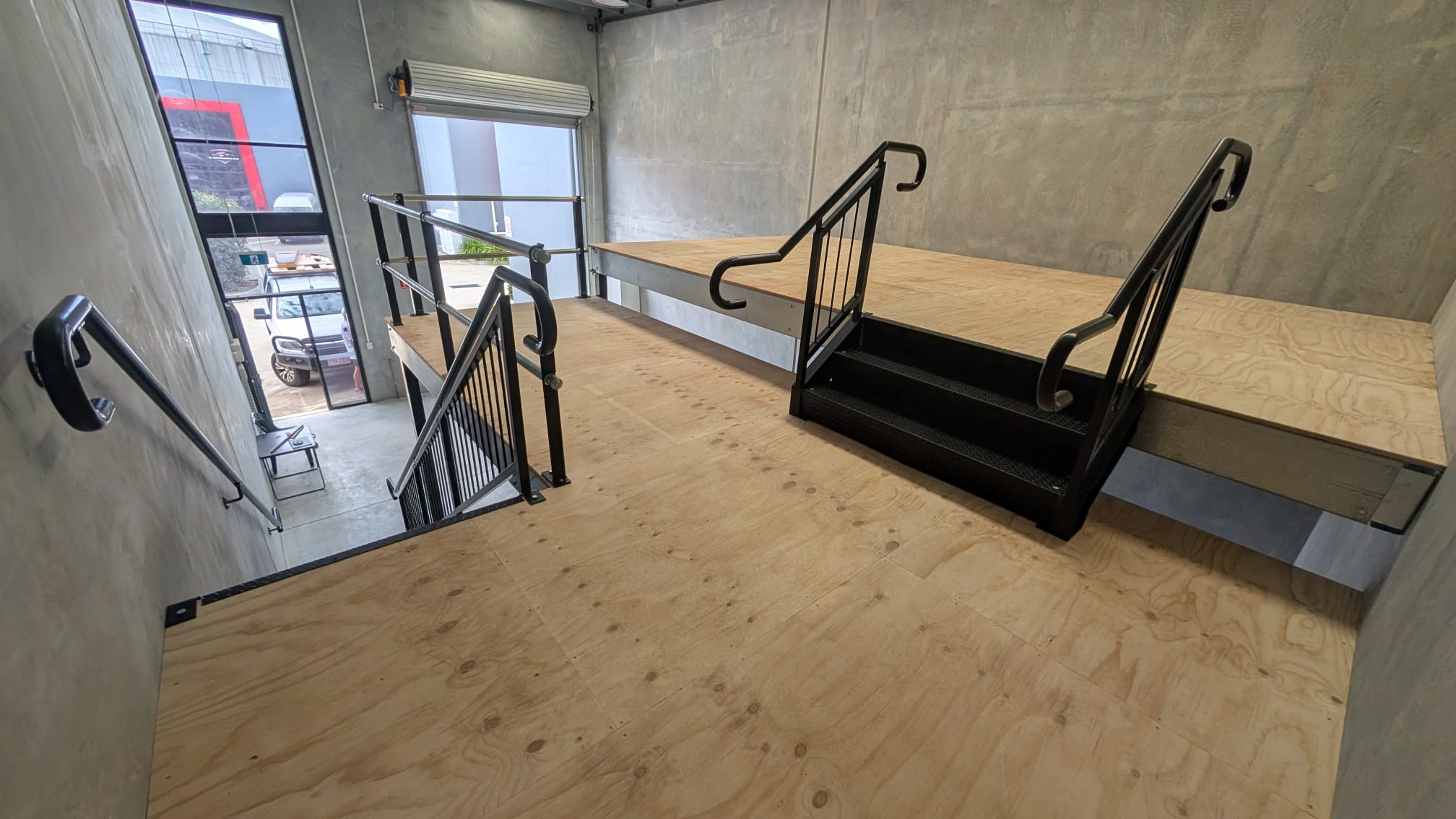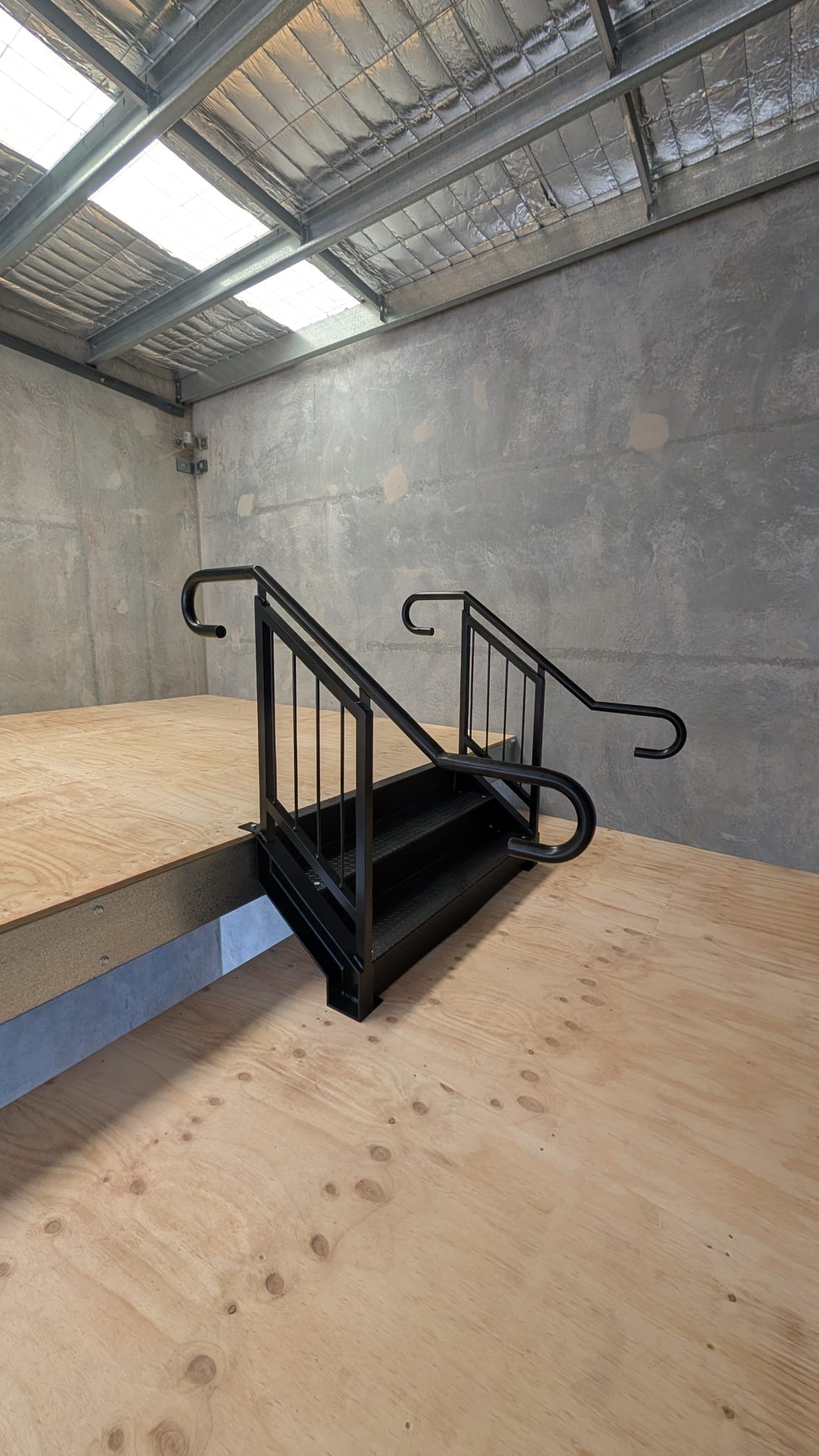 This one took the installation crew two days to build with two scissors and a fork lift. The staircase has 1000mm Treads -with AS1428 Rails and Treads and the black powder coating really gives it a sleek finish.