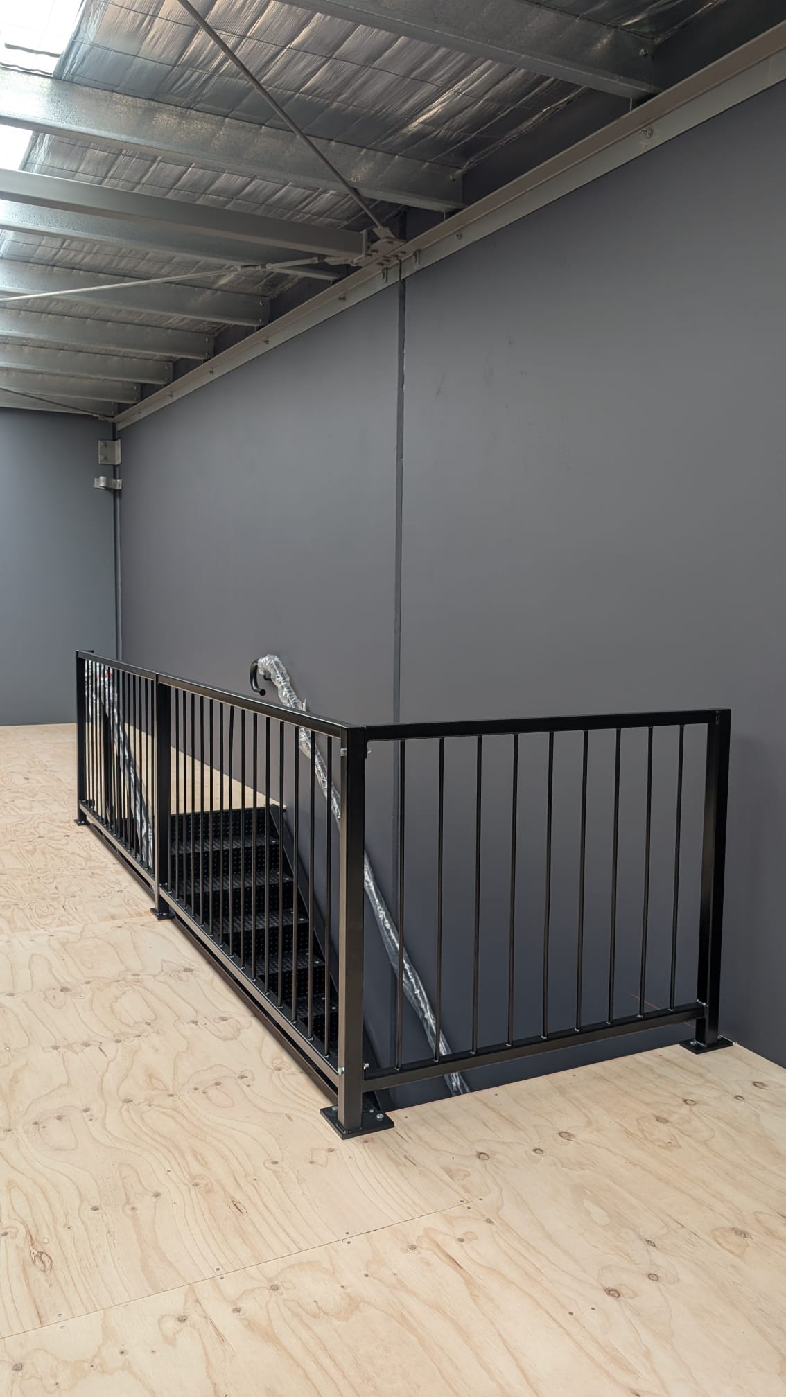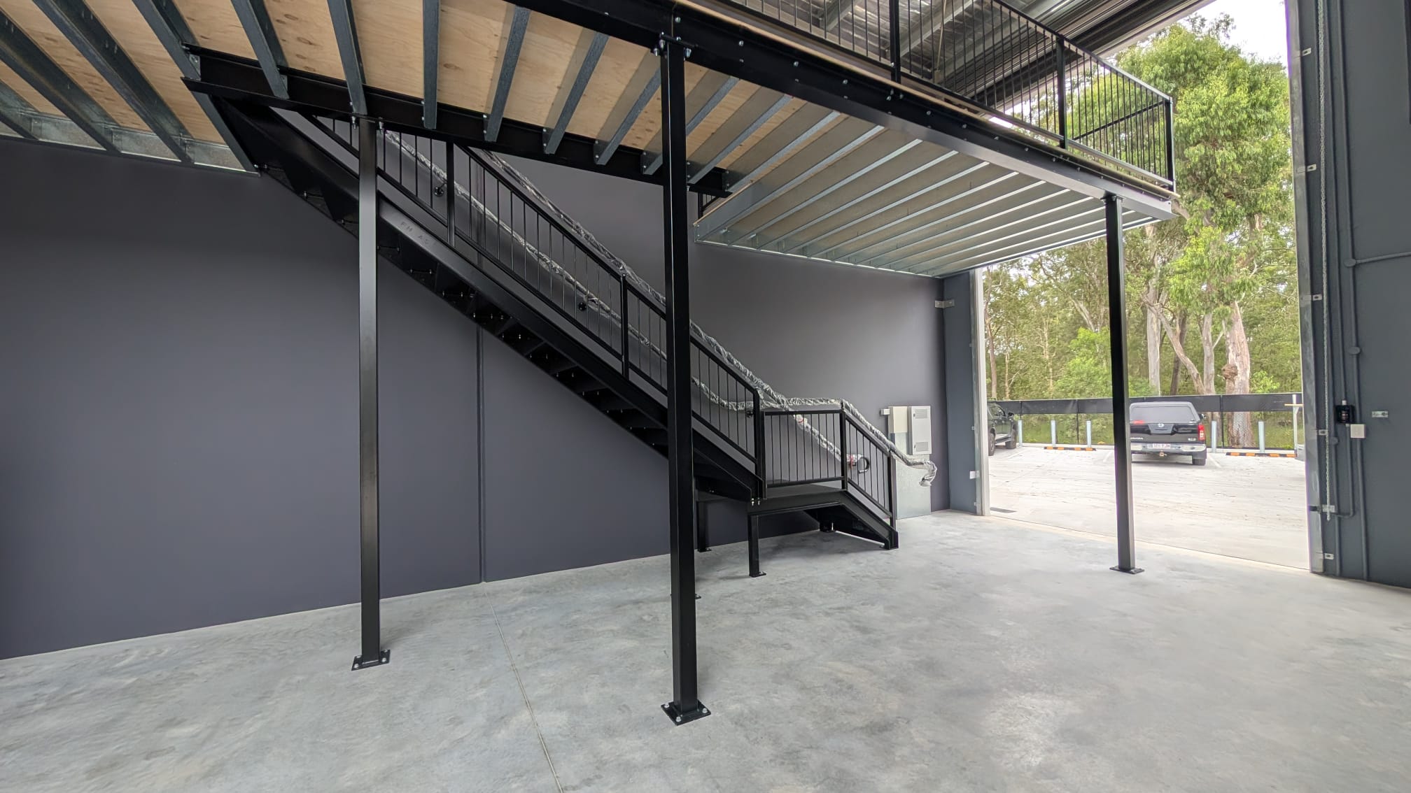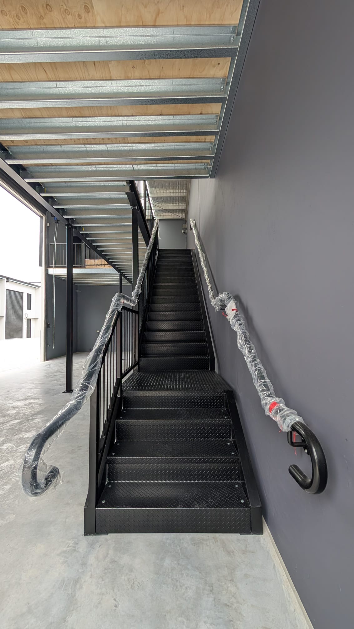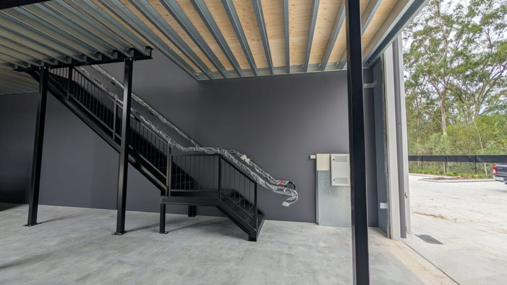 Designed with a 5kPa load rating, the mezzanine easily meets the demands of fitness and recovery equipment. It features NCC-compliant balustrades and an AS1428 compliant staircase, ensuring accessibility and safety without compromising on design. The black powder coated finish ties the space together with a bold, modern look.