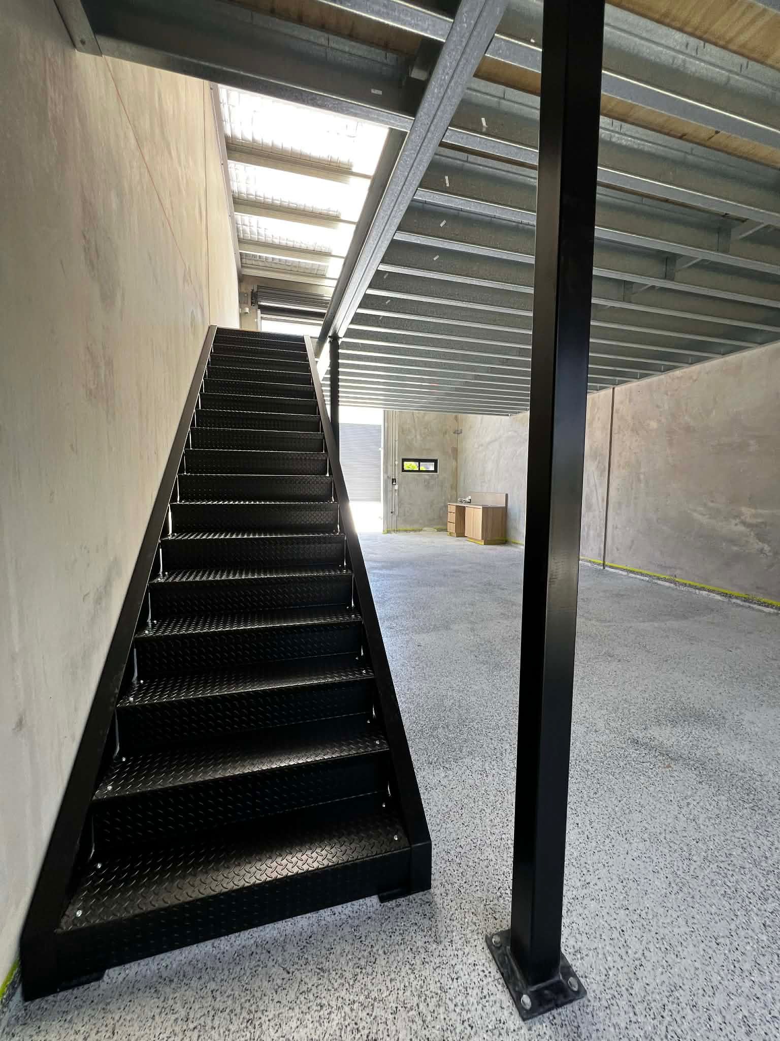 For the finishing touches, the stairs and posts were powder-coated in black for a clean, modern look. The structure features a 3kPa load rating, 21mm plywood flooring and 1000mm aluminium stair treads.